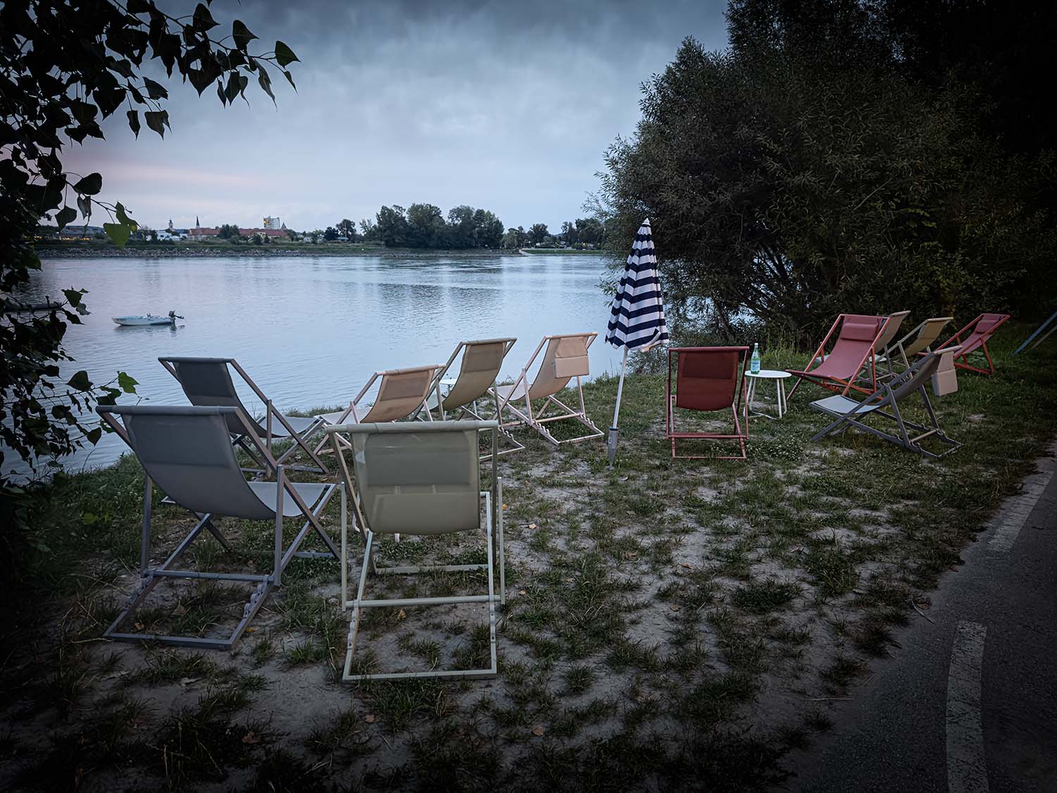 Hier kann man sich auch mit einem Cocktail oder einer Flasche Wein auf einen der Liegestühle am Wasser fläzen und dem großen Strom beim Strömen zuschauen – Mekong an der Donau!