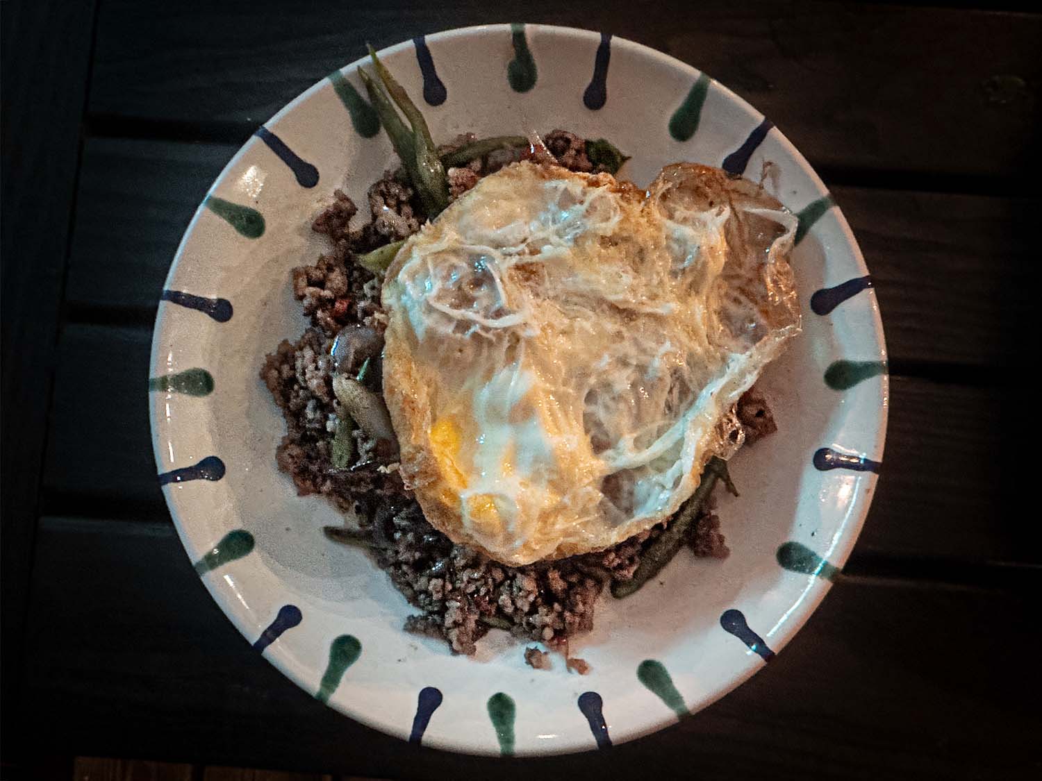 - Phat Kaprao – der thailändische Streetfood-Klassiker wird hier zubereitet wie sich’s gehört: mit einem im Wok knusprig braun durchgebratenen Spiegelei. Hier hätte ein rinnender Dotter nichts zu suchen. Wir finden es sympathisch ehrlich, dass die Gerichte ohne jegliche Behübschung serviert werden.