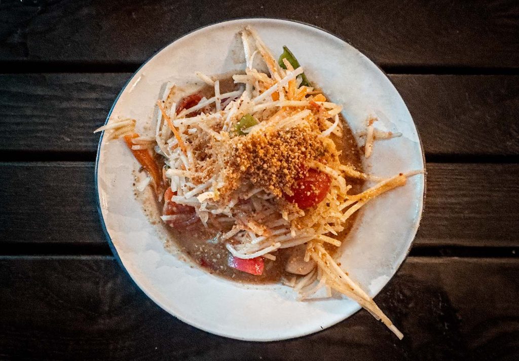 Es gibt hier aber kein Schnitzel und auch keine Hauberlkuchen, sondern ausschließlich Gerichte, die eine südostasiatische Kochsprache sprechen, besonders die der thailändischen Isan-Region inklusive des benachbarten Laos: Larb, Phat Kaprao, Som Tam…