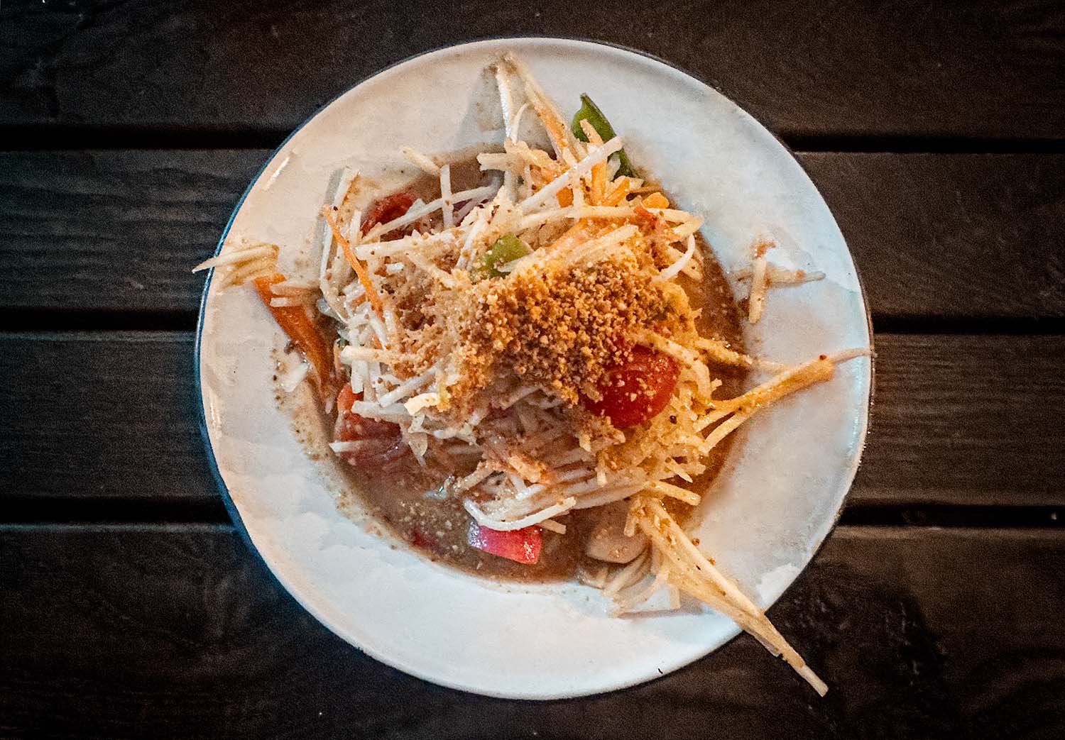 Green Kohlrabi Salad – eine geniale Interpretation des thailändischen Speiseformats Som Tam – im Original mit unreifer, grüner Papaya zubereitet, die hier durch frisch geraspelten Kohlrabi ersetzt wird, und eigentlich fast noch besser schmeckt als das Original. Die Knackigkeit ist sehr ähnlich, aber der Kohlrabi schmeckt noch frischer und saftiger als die Tropenfrucht. Dieser köstliche Salat bei der Fischerin hat uns als Vorbild zu einem eigenen Rezeptvideo inspiriert: som tam mit kohlrabi