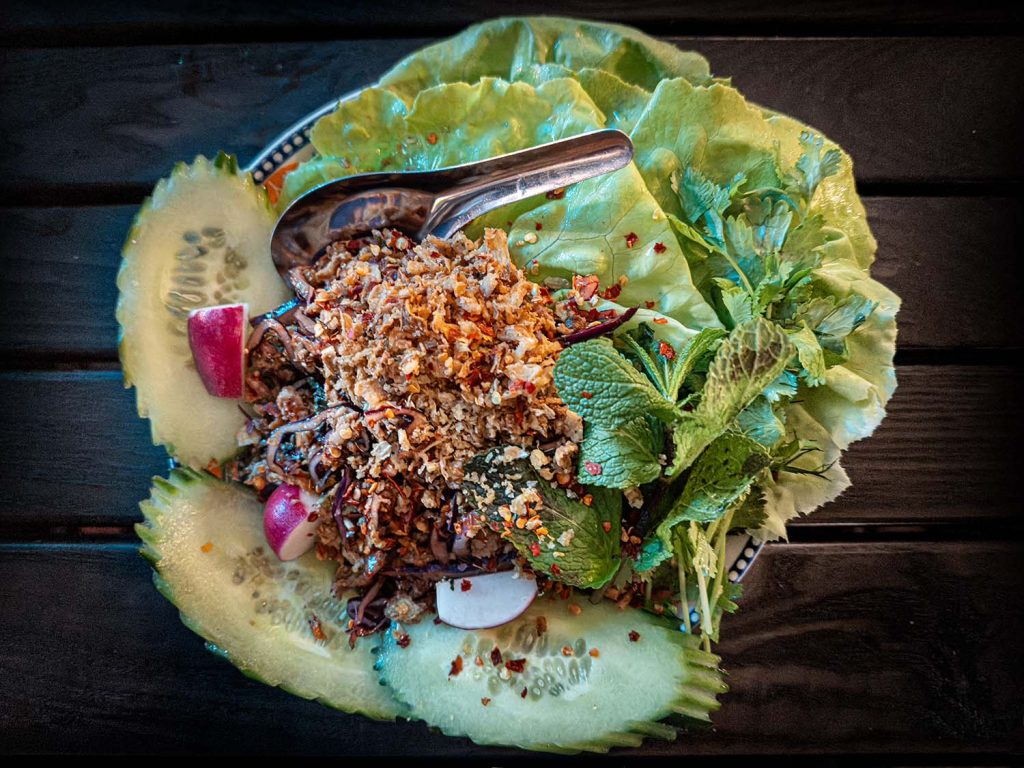 - Duck Larb – fein gehacktes, gebratenes Entenfleisch mit Kräutern, Gewürzen, Rotkraut und allerlei Knusperzeug (geröstete Reiskörner und Röstzwiebel). Wird zum Essen mit frischen Kräutern in Salatblätter gewickelt.